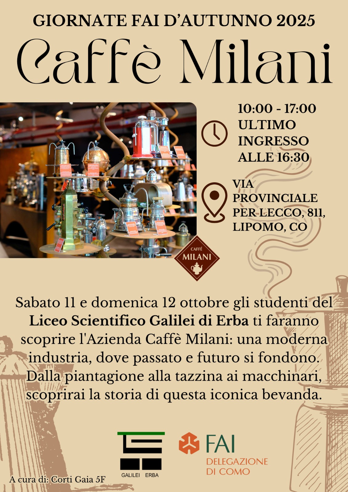 Sabato 11 ottobre e domenica 12 ottobre p.v. dalle 10:00 alle 17:00 (ultimo ingresso ore 16:30) alcuni studenti delle classi quarte e quinte del Liceo “Galilei” di Erba parteciperanno in qualità di “Apprendisti Ciceroni “alle giornate FAI d’Autunno 2025. Il bene che illustreranno i nostri studenti è l’edificio della storica Azienda Caffè Milani di Lipomo, in via Provinciale, 811. Si invita la comunità scolastica, genitori, studenti, docenti e tutto il personale, a non perdere questo straordinario evento, per conoscere e il valore del patrimonio che ci circonda. In allegato la locandina dell’evento.