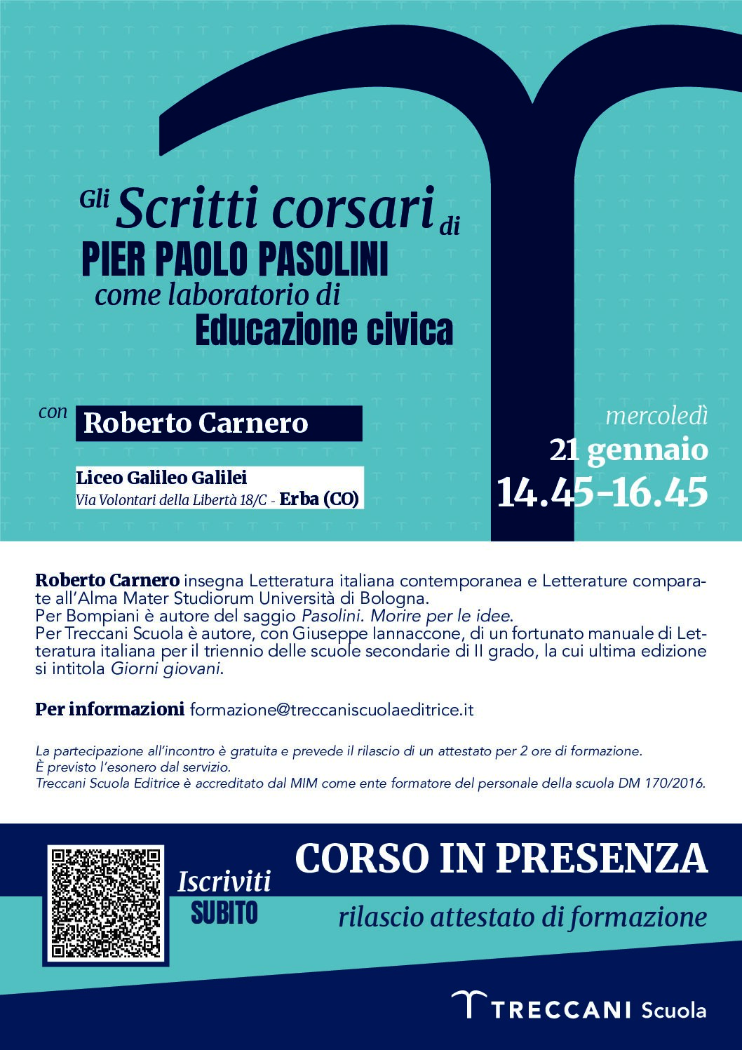 Mercoledì 21 gennaio 2026, ore 14,45-16,45 presso la Biblioteca del Liceo Galilei di Erba